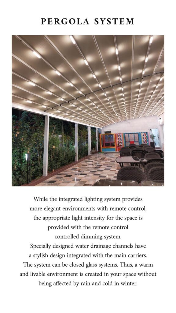 Eurovision Windows & Door makes your outdoor spaces more functional by offering customized pergola solutions. Whether shading the space or creating an aesthetic design, our pergolas can be designed to suit any need. In addition, with our special opening and closing models, it is possible to adapt your pergola systems according to weather conditions. This flexibility makes outdoor spaces usable all year round.